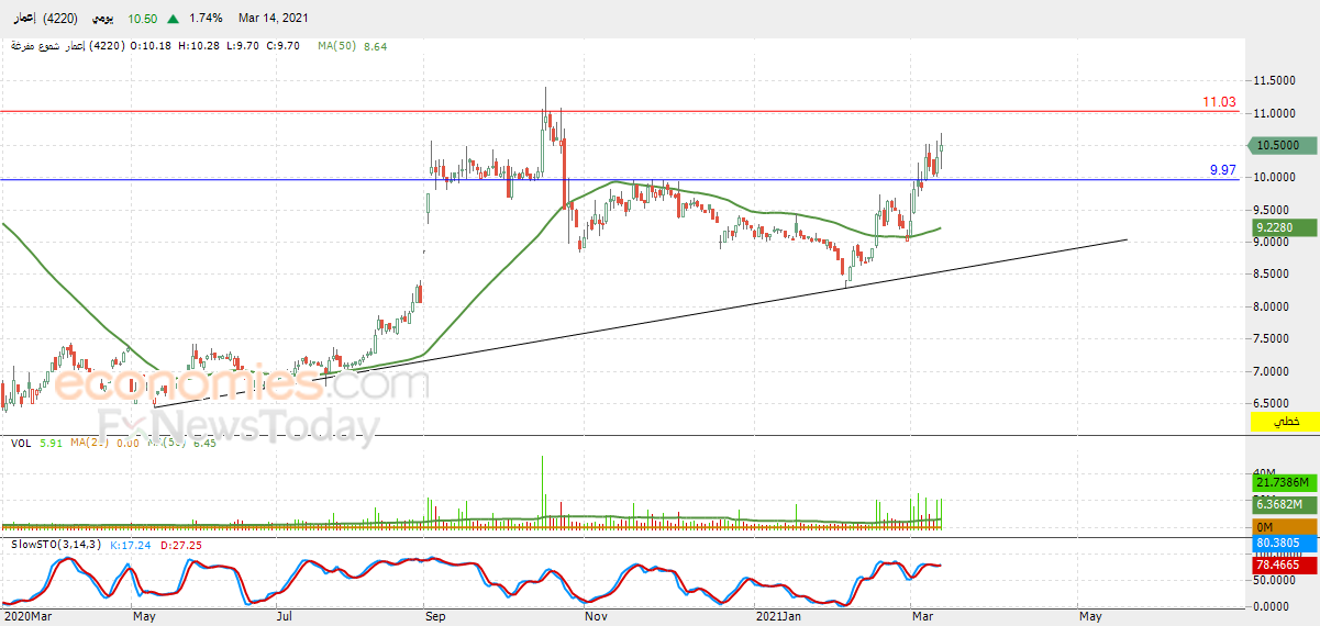نطاق التداول المتوقع لهذا اليوم ما بين مستوى الدعم 9.97 ومستوى المقاومة 11.00.