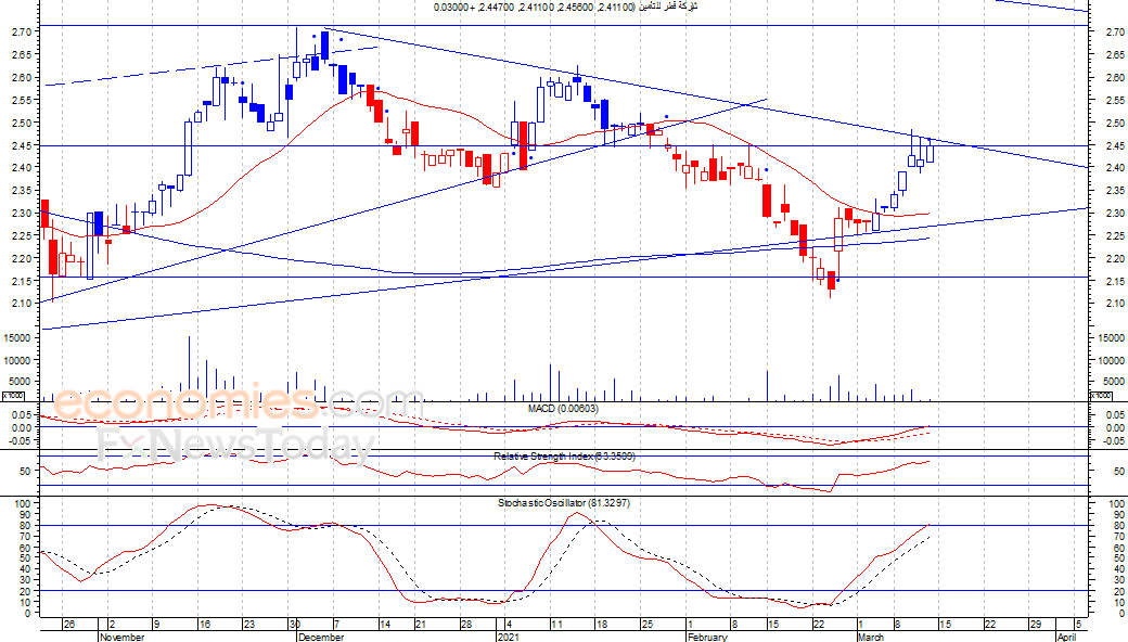 انهى السهم تداولات امس الاحد اولى جلسات الأسبوع الحالي مرتفعا عند مستوى 2.447 ريال، ملامسا بذلك لخط اتجاهه الهابط متوسط الأجل، والذي يشكل مقاومة قد تضغط على السهم لاسفل للوصول لمستوى الدعم 2.30 ريال في عملية جني ارباح في الاجل القصير، شرط بقاء السهم اسفل مستوى 2.50 ريال.