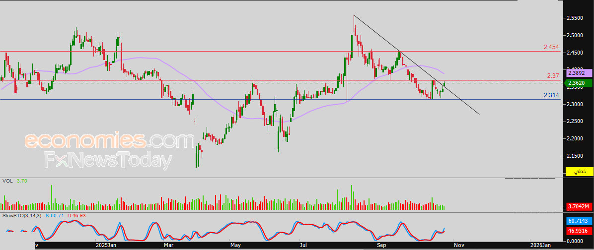لهذا فتوقعاتنا تميل نحو هبوط سعر السهم خلال تداولاته القادمة، طيلة ثبات مستوى المقاومة 2.37 ريال، ليستهدف مستوى الدعم 2.314 ريال.