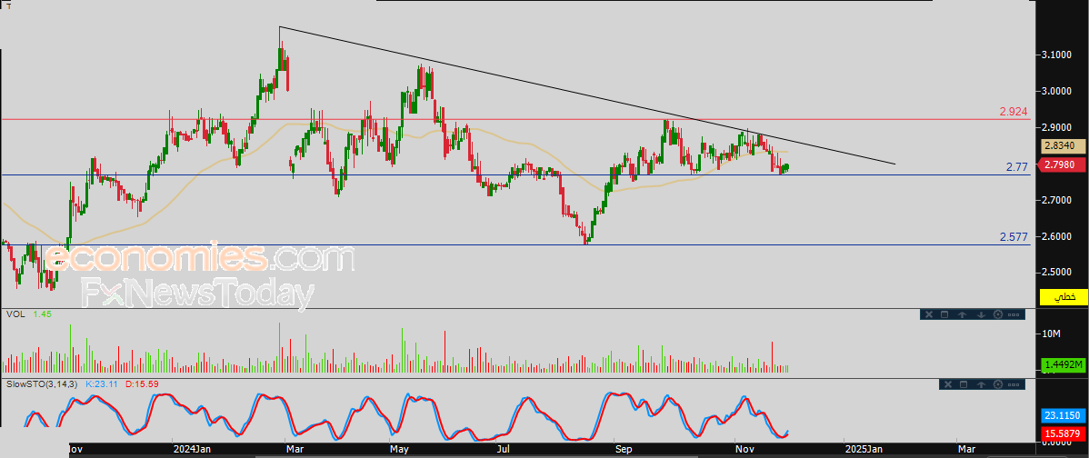 لهذا فتوقعاتنا تشير إلى المزيد من الهبوط لسعر السهم خلال تداولاته القادمة، خاصة في حالة كسره لمستوى الدعم السابق ذكره 2.77، ليستهدف بعدها مستوى الدعم 2.577.