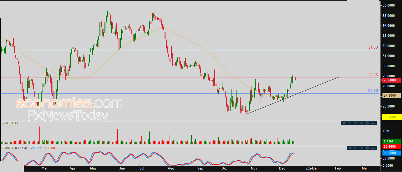 لهذا فتوقعاتنا ترجح عودة ارتفاع السهم خلال تداولاته القادمة، بشرط اختراقه أولاً لمستوى المقاومة 28.85، ليستهدف بعدها مستوى المقاومة 31.60.