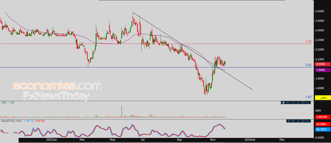 لذلك فتوقعاتنا ترجح عودة ارتفاع السهم خلال تداولاته القادمة، طيلة استقراره فوق مستوى الدعم 2.00، ليستهدف مستوى المقاومة 2.25.