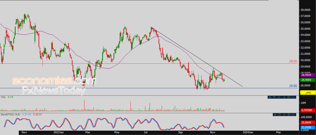 لذلك نحن نرجح عودة انخفاض السهم خلال تداولاته القادمة، ليستهدف مستوى الدعم المحوري والقريب 25.60.