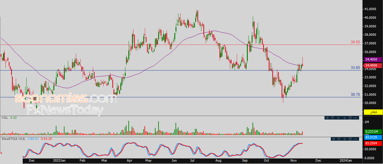 لذلك نحن نرجح عودة ارتفاع السهم خلال تداولاته القادمة، طيلة استقراره فوق مستوى 33.85، ليستهدف مستوى المقاومة 36.85.