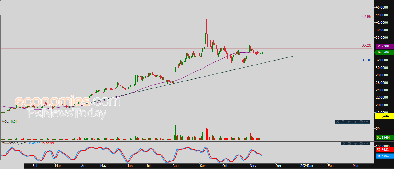 لذلك نحن نتوقع المزيد من الارتفاع للسهم خلال تداولاته القادمة، خاصة في حالة اختراقه للمقاومة 35.20، ليستهدف بعدها مستوى المقاومة المحوري 42.95.