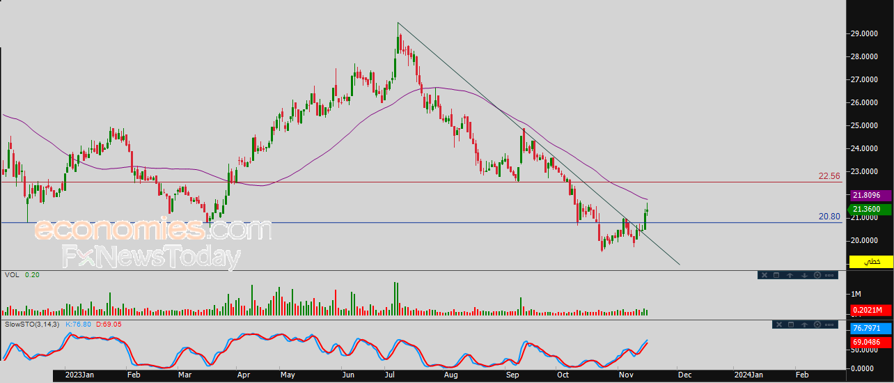 لهذا تشير توقعاتنا إلى المزيد من الصعود للسهم خلال تداولاته القادمة، طيلة استقراره فوق مستوى 20.80، ليستهدف مستوى المقاومة 22.56.