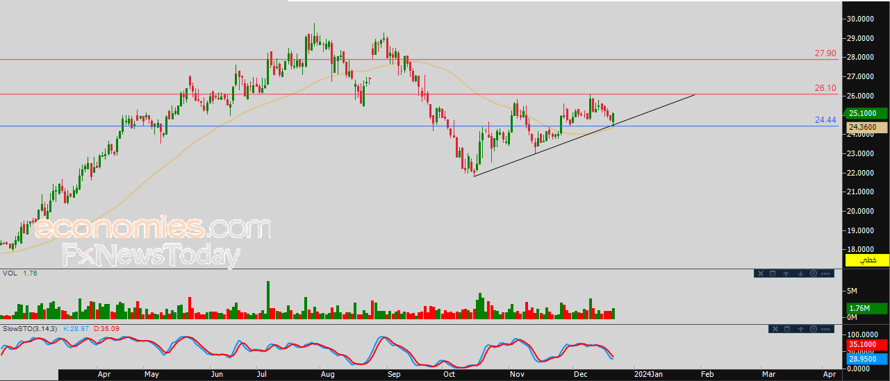 لذلك نحن نتوقع ارتفاع السهم خلال تداولاته القادمة، بشرط ثبات مستوى الدعم 24.44، ليستهدف أولى مستويات المقاومة عند 26.10.