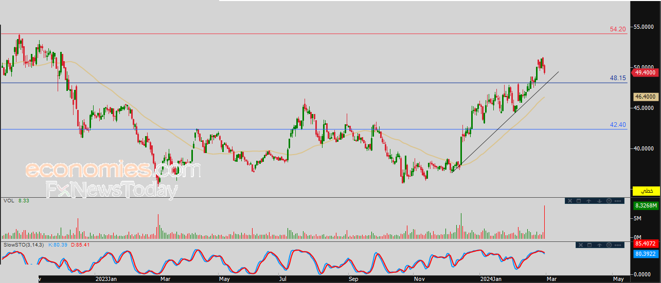 لهذا نحن نرجح عودة ارتفاع السهم خلال تداولاته القادمة، بشرط ثبات مستوى الدعم 48.15، ليستهدف مستوى المقاومة 54.20.