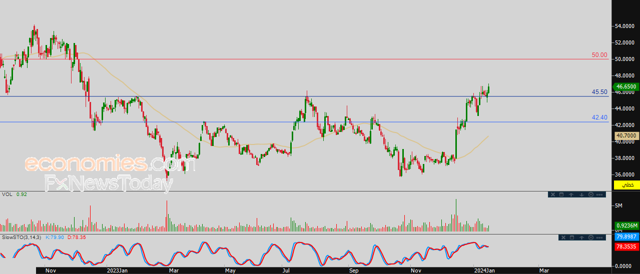 لهذا نحن نتوقع المزيد من الصعود للسهم خلال تداولاته القادمة، خاصة طيلة استقراره فوق مستوى 45.50، ليستهدف مستوى المقاومة 50.00.
