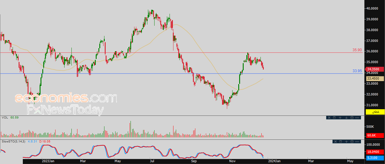 لذلك تشير توقعاتنا إلى ترجيح سيناريو عودة ارتفاع السهم خلال تداولاته القادمة، طيلة ثبات الدعم 33.95، ليستهدف من جديد مستوى المقاومة 35.90.