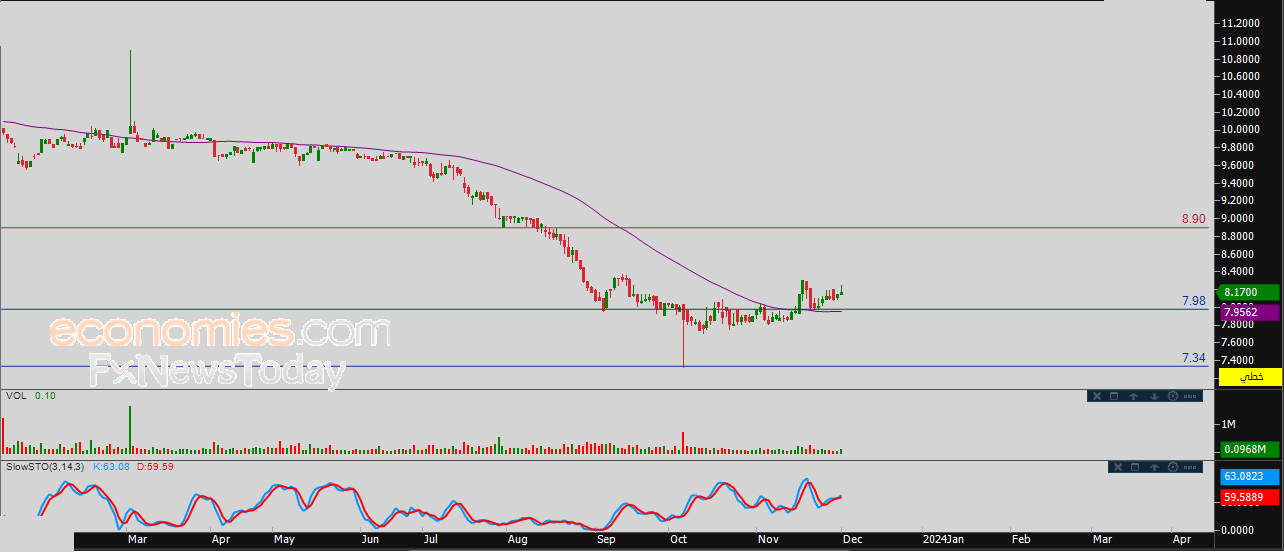 لذلك نحن نتوقع المزيد من الصعود للسهم خلال تداولاته القادمة، طيلة ثبات الدعم 7.98، ليستهدف مستوى المقاومة 8.90.