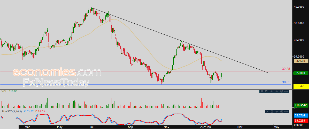 لذلك فتوقعاتنا ترجح عودة انخفاض السهم خلال تداولاته القادمة، طيلة ثبات المقاومة 32.25، ليستهدف مستوى الدعم المحوري 30.65.
