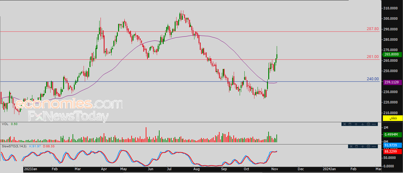 لذلك فتوقعاتنا تشير إلى المزيد من الصعود للسهم خلال تداولاته القادمة، خاصة طيلة استقراره فوق مستوى 261.00، ليستهدف أولى مستويات المقاومة عند 287.80.