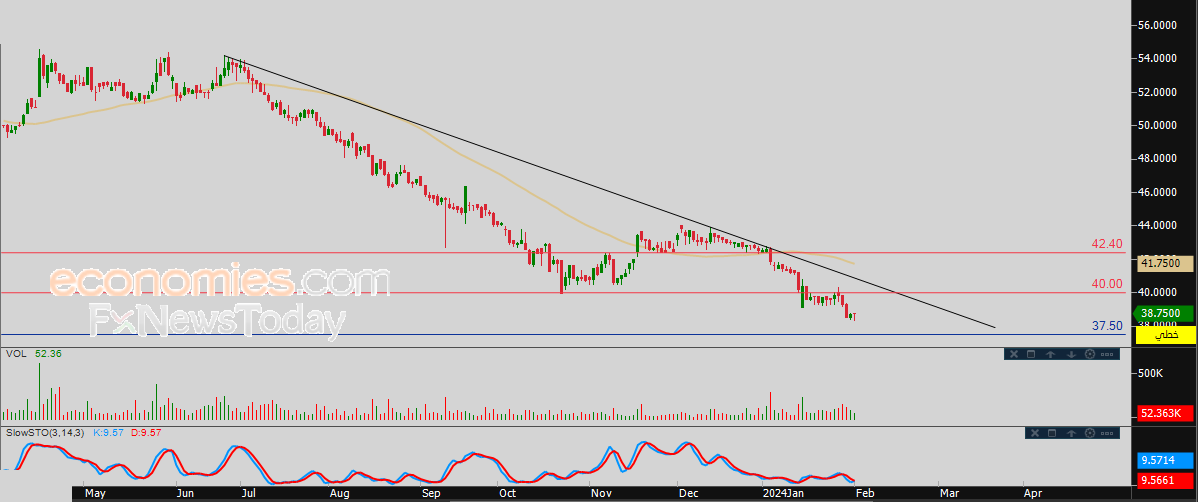 لهذا تشير توقعاتنا إلى ترجيح سيناريو عودة انخفاض السهم خلال تداولاته القادمة، طيلة استقراره دون مستوى المقاومة 40.00، ليستهدف مستوى الدعم 37.50.