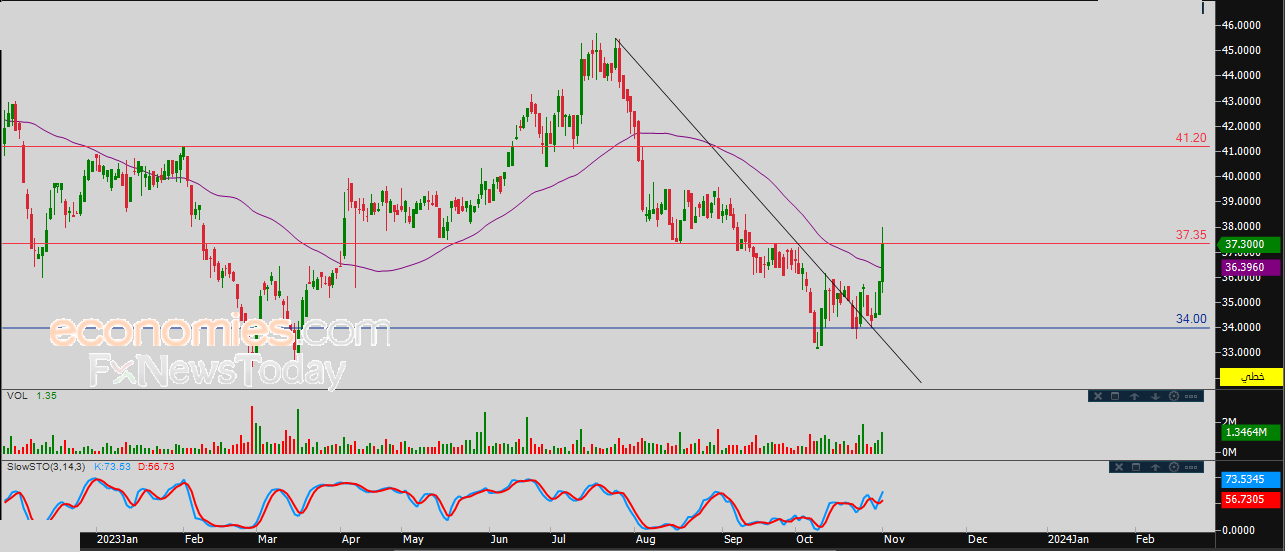 لذلك نحن نتوقع المزيد من الارتفاع للسهم خلال تداولاته القادمة، خاصة في حالة اختراقه للمقاومة 37.35، ليستهدف بعدها مستوى المقاومة 41.20.