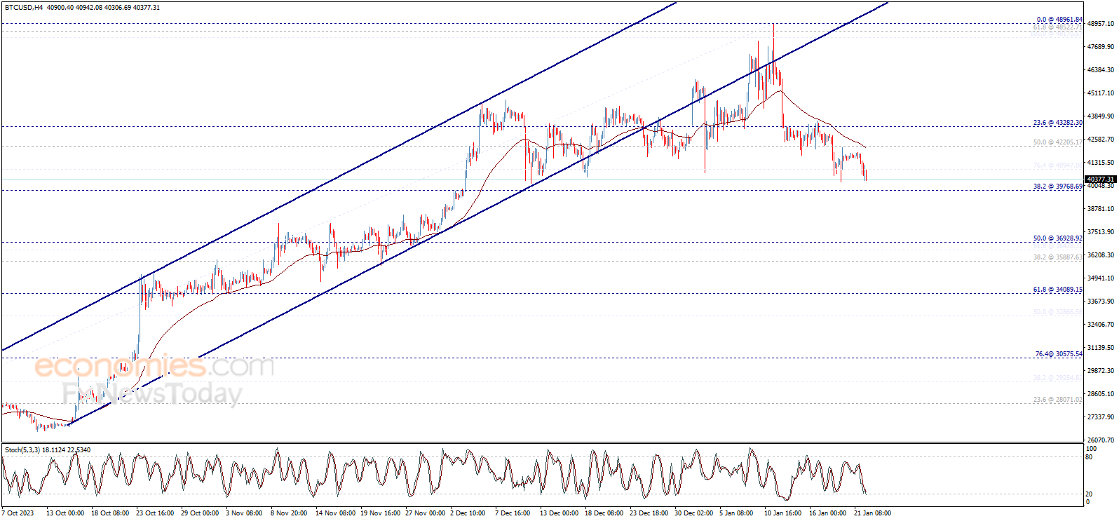يستمر سعر البتكوين (BTCUSD) بالانخفاض ليقترب من الهدف المنتظر عند 39770.00، ونرجّح استمرار الانخفاض لتخطّي هذا المستوى وتحقيق أهداف سلبية إضافية تصل إلى 36928.90، مع الانتباه إلى أن الفشل بكسر المستوى الأول سيقود السعر لبدء محاولات تعافي تستهدف زيارة مناطق 42205.20 مبدئياً.