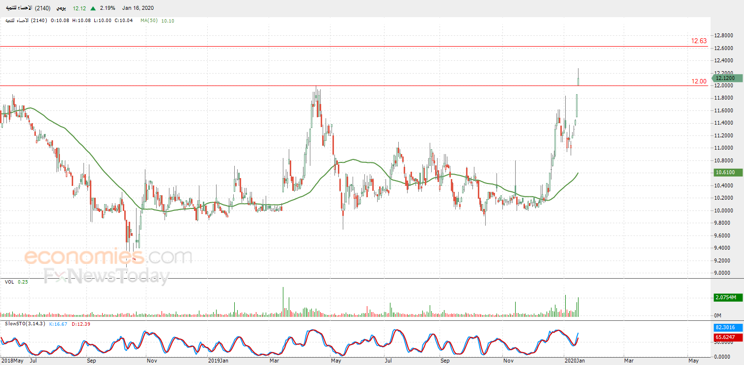 قفز سهم الاحساء للتنمية (2140) بتداولاته الأخيرة على المستويات اللحظية، لينجح السهم بهذا الارتفاع في اختراق مستوى المقاومة المحوري 12.00، محققاً أرباحاً في آخر جلساته بلغت نسبتها 2.19% بما يعادل 0.26 نقطة، في ظل سيطرة الاتجاه الصاعد على المدى القصير، مع استمرار الدعم الإيجابي لتداولاته أعلى متوسطه المتحرك البسيط لفترة 50 يوماً السابقة، وتتوارد الإشارات الإيجابية بمؤشرات القوة النسبية، وسط ارتفاع ملحوظ في أحجام التداول.