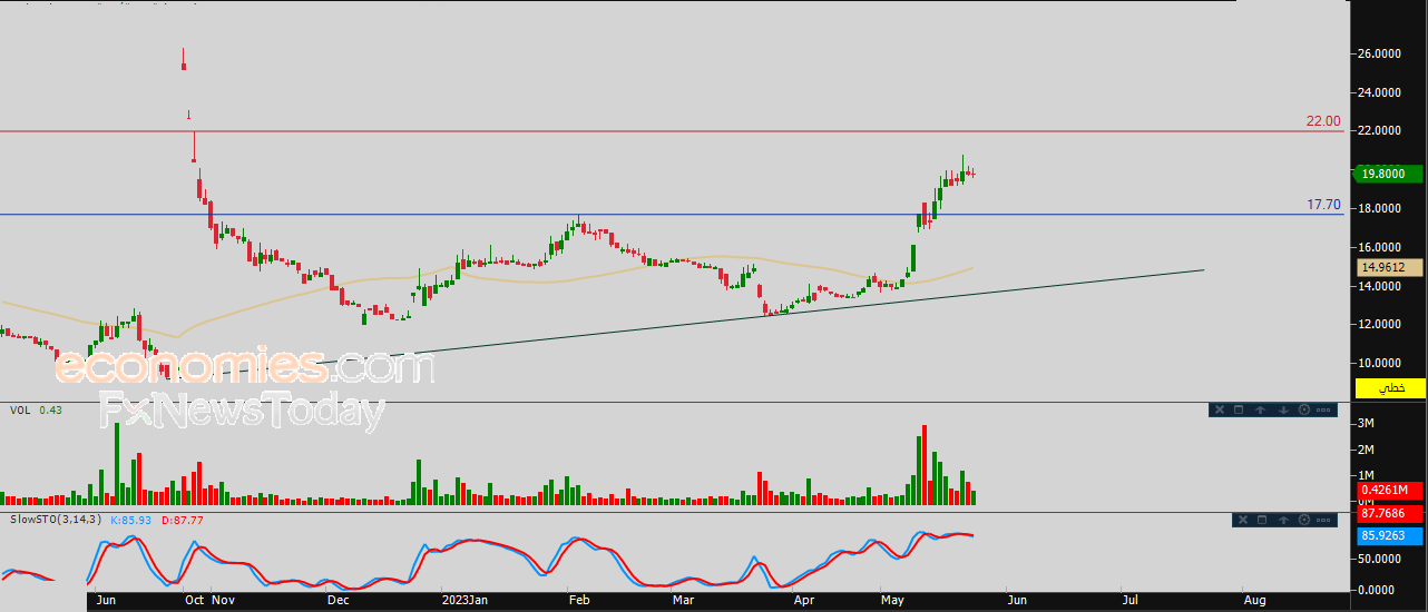 لهذا تشير توقعاتنا إلى المزيد من الصعود للسهم خلال تداولاته القادمة، طيلة ثبات الدعم 17.70، ليستهدف مستوى المقاومة 22.00.