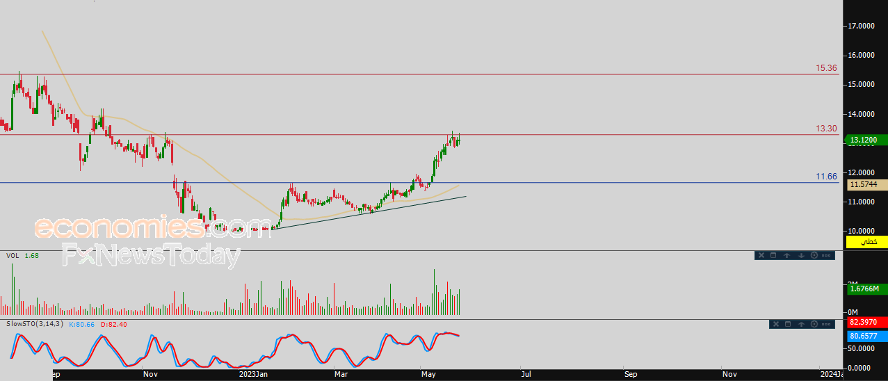 لذلك نحن نتوقع المزيد من الصعود للسهم خلال تداولاته القادمة، خاصة في حالة اختراقه لمستوى المقاومة 13.30، ليستهدف بعدها مستوى المقاومة 15.36.