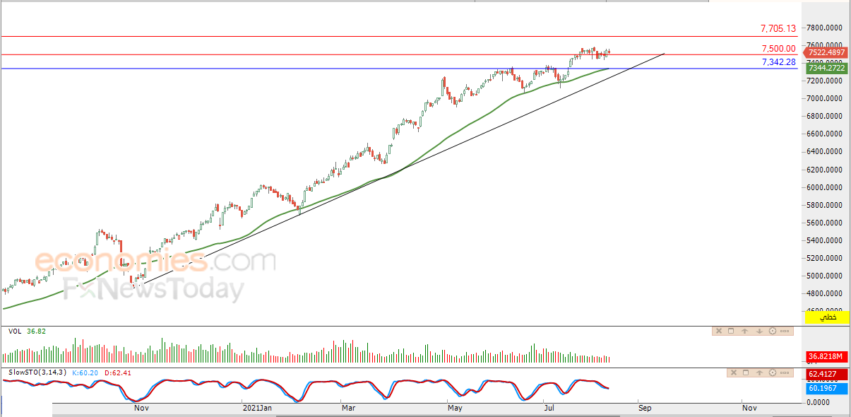 نطاق التداول المتوقع لهذا اليوم ما بين مستوى الدعم 7,300.00 ومستوى المقاومة 7,600.00.