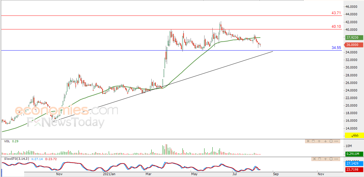 نطاق التداول المتوقع لهذا اليوم ما بين مستوى الدعم 34.55 ومستوى المقاومة 37.90.