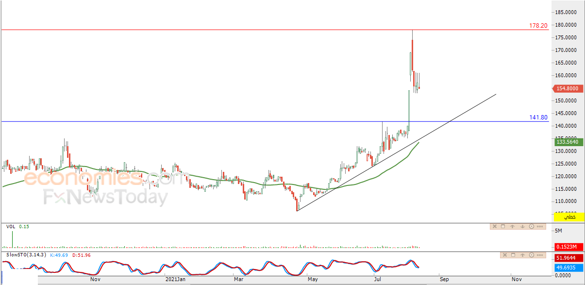 لهذا نحن نرجح ارتفاع السهم خلال تداولاته القادمة، طيلة ثبات الدعم 141.80، ليستهدف من جديد مستوى المقاومة 178.20.