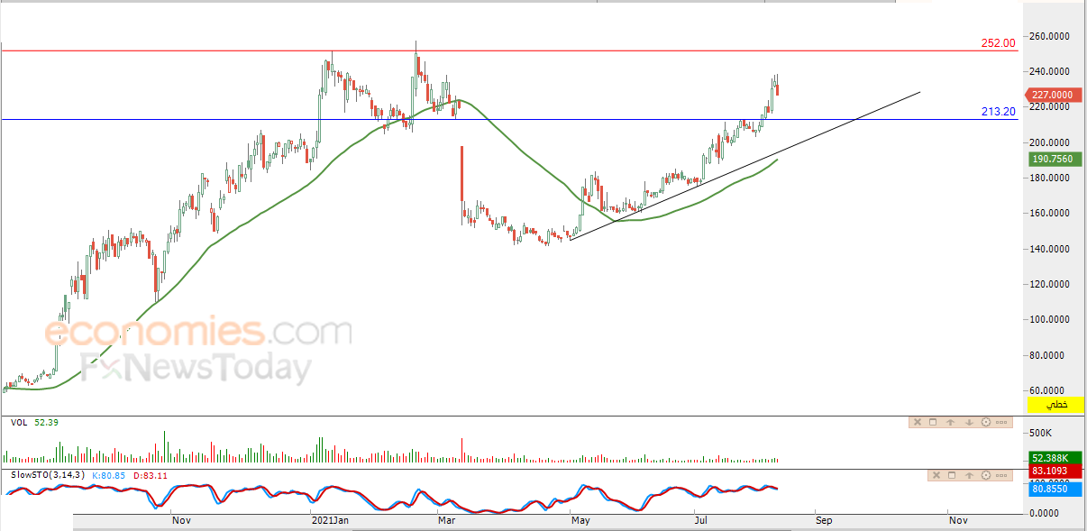 نطاق التداول المتوقع لهذا اليوم ما بين مستوى الدعم 213.20 ومستوى المقاومة 252.00.
