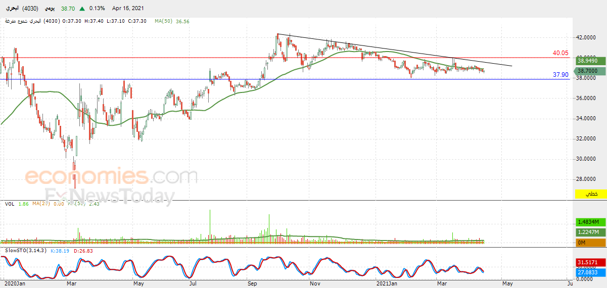 نطاق التداول المتوقع لهذا اليوم ما بين مستوى الدعم 37.90 ومستوى المقاومة 40.00.