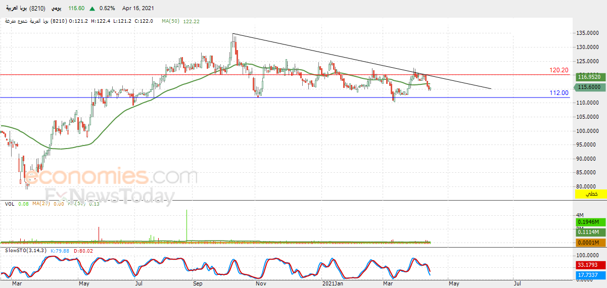 نطاق التداول المتوقع لهذا اليوم ما بين مستوى الدعم 112.00 ومستوى المقاومة 120.20.