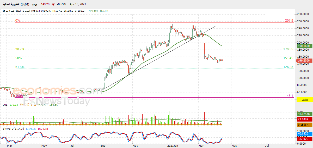 عاود سهم التطويرية الغذائية (9501) الانخفاض بتداولاته الأخيرة على المستويات اللحظية، وسط استمرار الضغط السلبي لتداولاته دون المتوسط المتحرك البسيط لفترة 50 يوماً السابقة، مع استقرار تداولاته دون مستوى المقاومة 151.45، هذا المستوى الذي يمثل نسبة 50% من مستويات فيبوناتشي التصحيحية لآخر موجة صاعدة على المدى المتوسط (من 45.10 إلى 257.8).