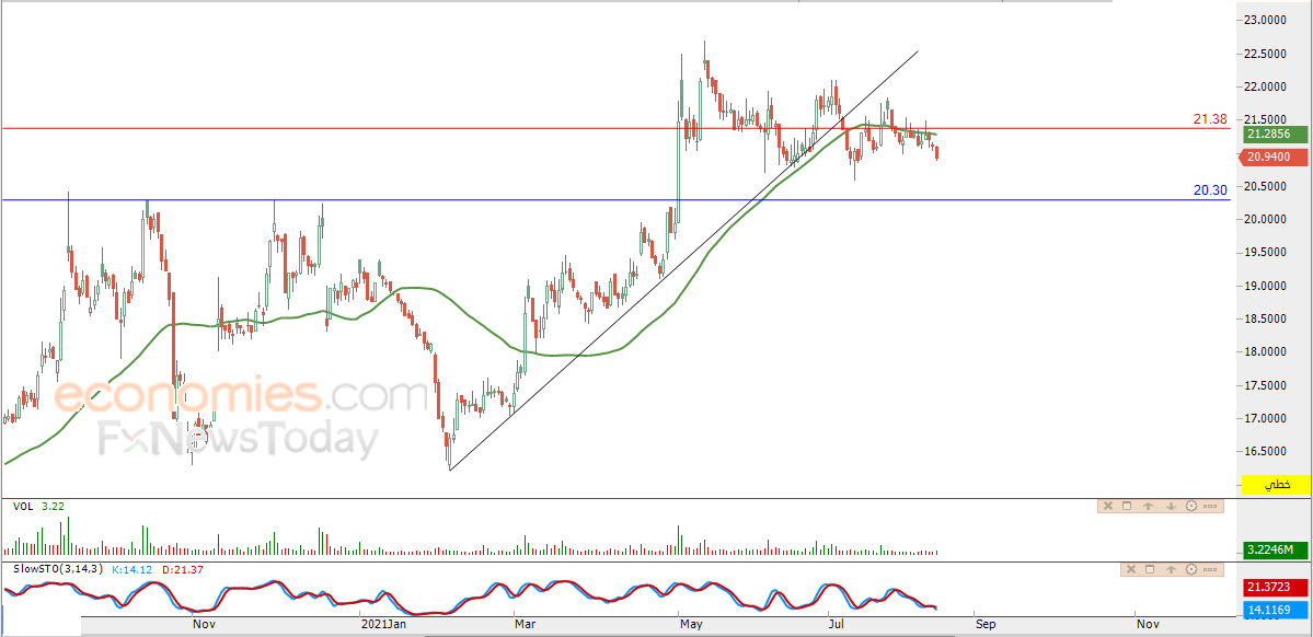 نطاق التداول المتوقع لهذا اليوم ما بين مستوى الدعم 20.60 ومستوى المقاومة 21.38.