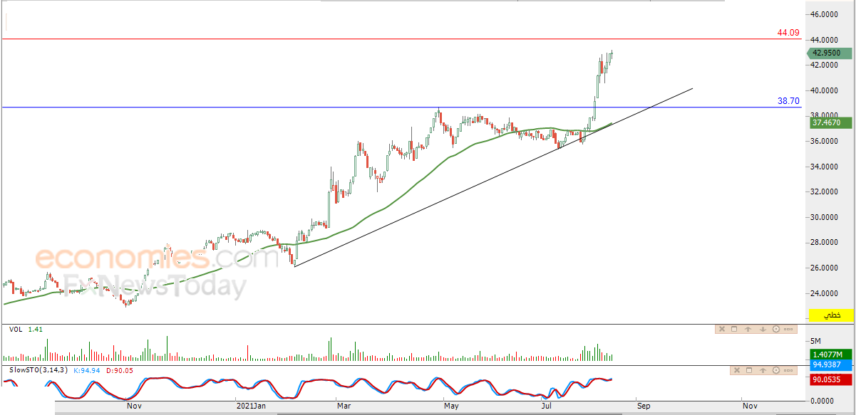لذلك تشير توقعاتنا إلى استمرار صعود السهم خلال تداولاته القادمة، ليستهدف مستوى المقاومة القريب 44.00.
