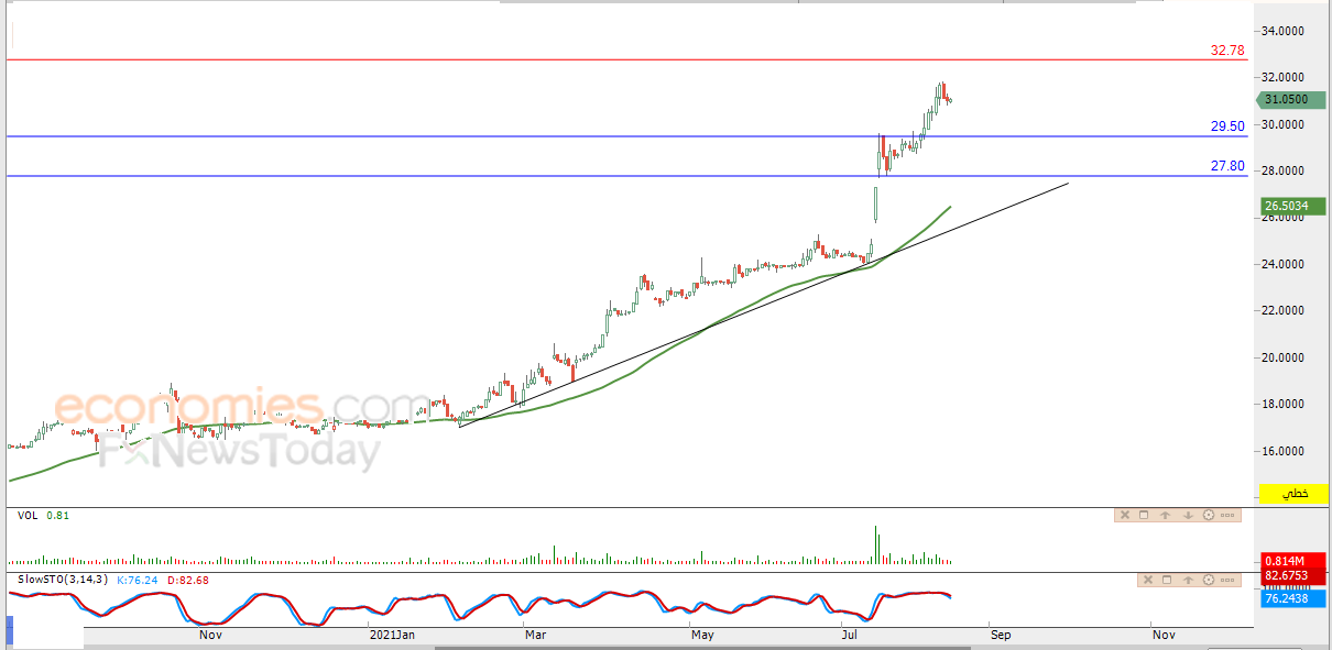 لهذا تشير توقعاتنا إلى ارتفاع السهم خلال تداولاته القادمة، طيلة ثبات الدعم 29.50، ليستهدف مستوى المقاومة 32.75.