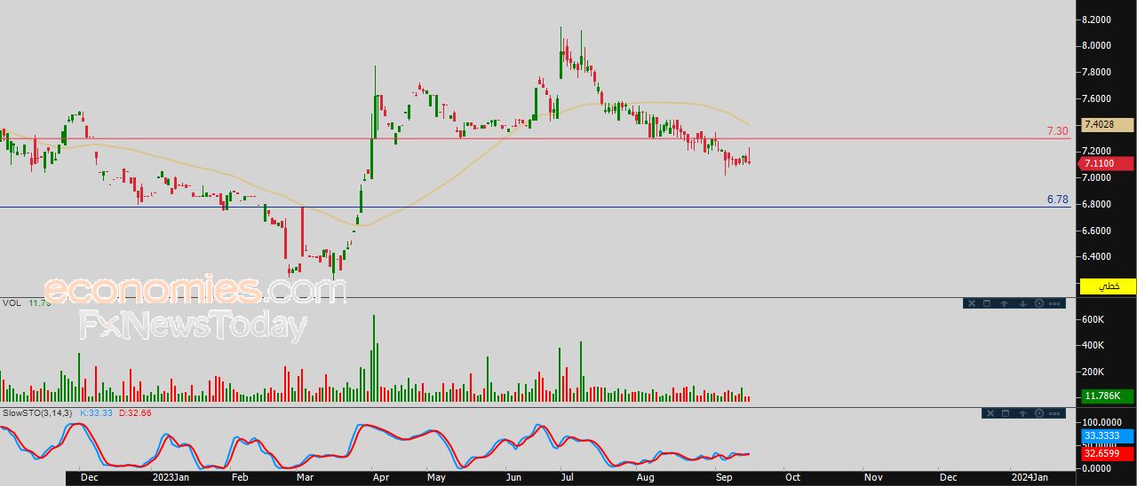 لهذا تشير توقعاتنا إلى المزيد من الانخفاض للسهم خلال تداولاته القادمة، طيلة استقراره دون مستوى المقاومة 7.30، ليستهدف مستوى الدعم 6.78.