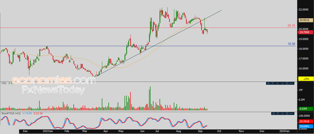لذلك فتوقعاتنا تشير إلى المزيد من الانخفاض للسهم خلال تداولاته القادمة، طيلة استقراره دون مستوى المقاومة 20.16، ليستهدف مستوى الدعم 18.30.