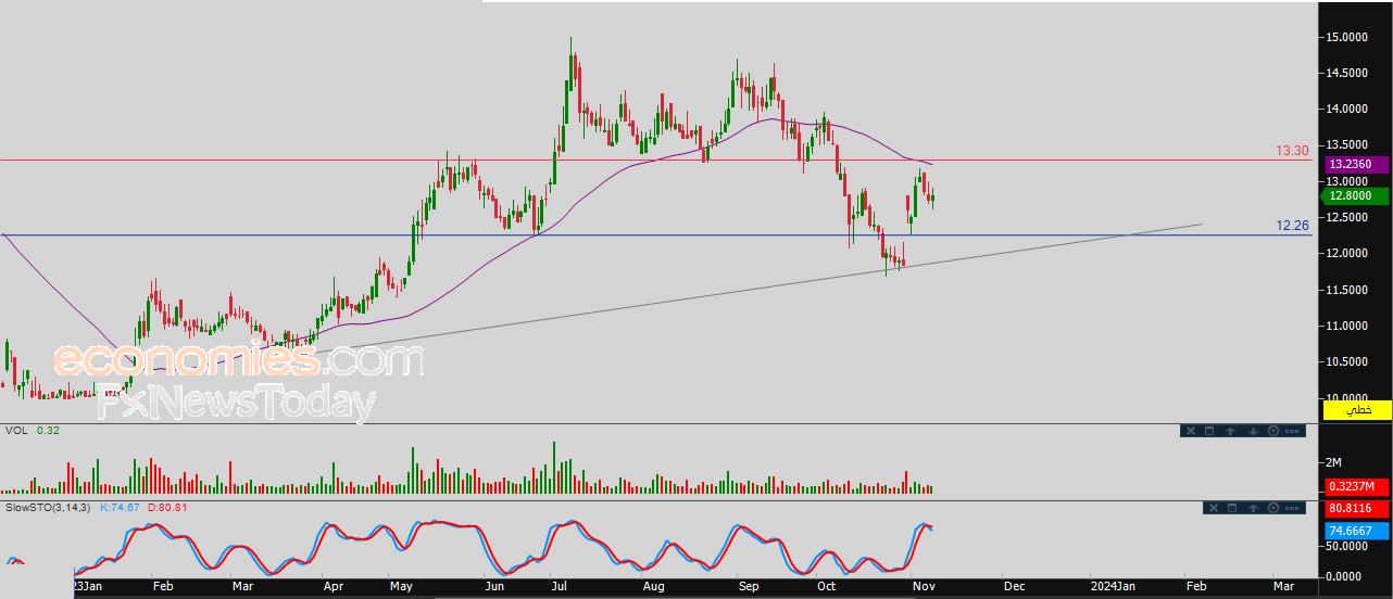 لهذا فتوقعاتنا ترجح عودة انخفاض السهم خلال تداولاته القادمة، طيلة استقراره دون مستوى المقاومة 13.30، ليستهدف مستوى الدعم 12.25.