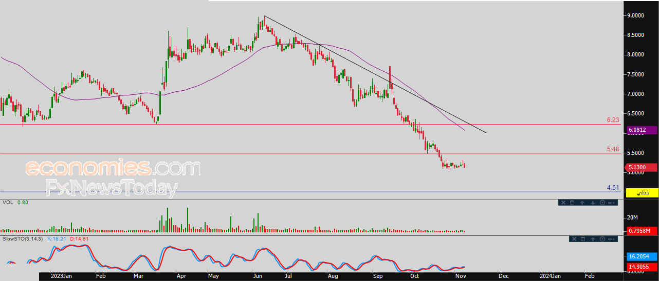 لذلك فتوقعاتنا تشير إلى المزيد من الانخفاض للسهم خلال تداولاته القادمة، طيلة استقراره دون مستوى المقاومة 5.48، ليستهدف مستوى الدعم 4.50.