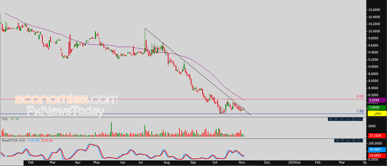 لهذا نحن نرجح عودة انخفاض السهم خلال تداولاته القادمة، طيلة ثبات المقاومة 8.00، ليستهدف من جديد مستوى الدعم 7.68.