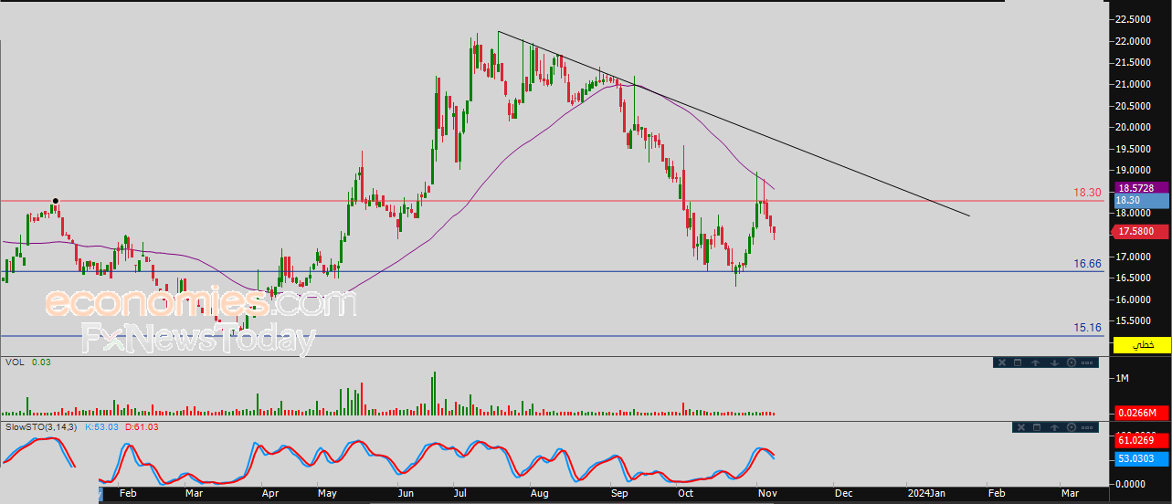 لذلك تشير توقعاتنا إلى المزيد من الانخفاض للسهم خلال تداولاته القادمة، طيلة ثبات المقاومة 18.30، ليستهدف مستوى الدعم 16.65.
