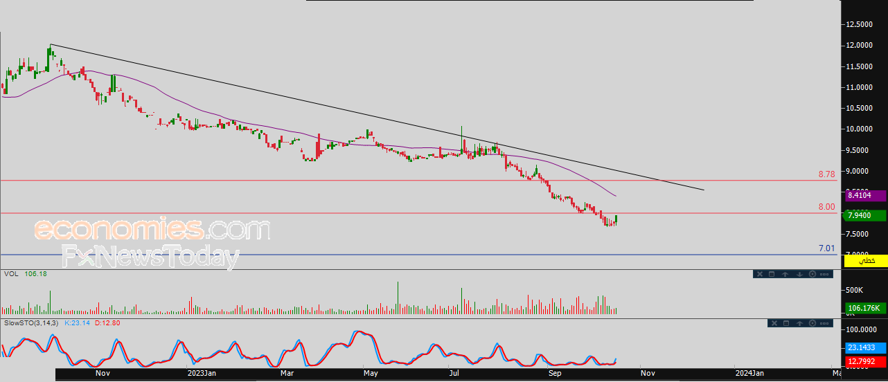لذلك فتوقعاتنا ترجح عودة انخفاض السهم خلال تداولاته القادمة، خاصة طيلة استقراره دون مستوى 8.00، ليستهدف مستوى الدعم 7.00.