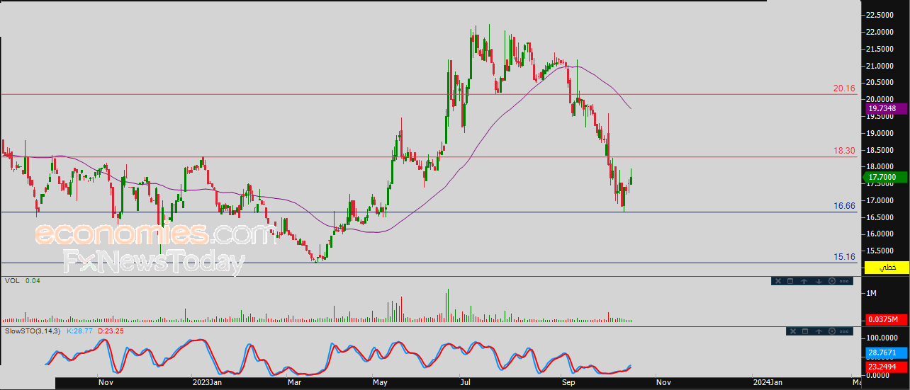 لهذا فنحن نرجح عودة انخفاض السهم خلال تداولاته القادمة، طيلة ثبات المقاومة 18.30، ليستهدف مستوى الدعم 16.66.