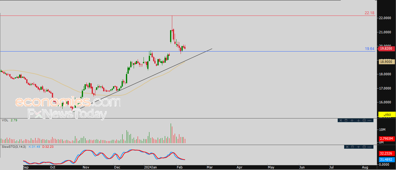 لهذا تشير توقعاتنا إلى ترجيح سيناريو عودة ارتفاع السهم خلال تداولاته القادمة، طيلة استقراره فوق مستوى 19.64، ليستهدف من جديد مستوى المقاومة 22.18.