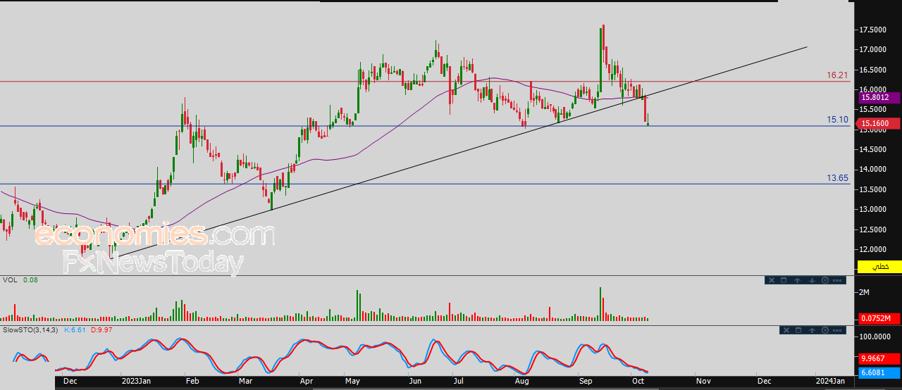 لهذا نحن نتوقع المزيد من الانخفاض للسهم خلال تداولاته القادمة، خاصة في حالة كسره للدعم 15.10، ليستهدف بعدها مستوى الدعم 13.65.