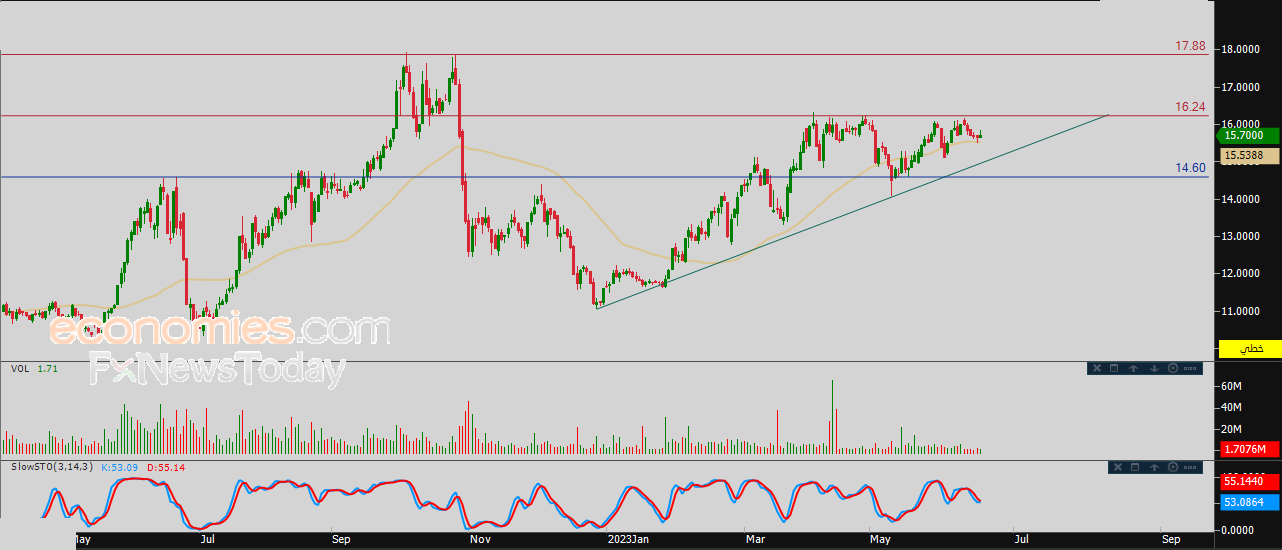 لهذا تشير توقعاتنا إلى المزيد من الصعود للسهم خلال تداولاته القادمة، خاصة في حالة اختراقه للمقاومة 16.24، ليستهدف بعدها مستوى المقاومة المحوري 17.88.