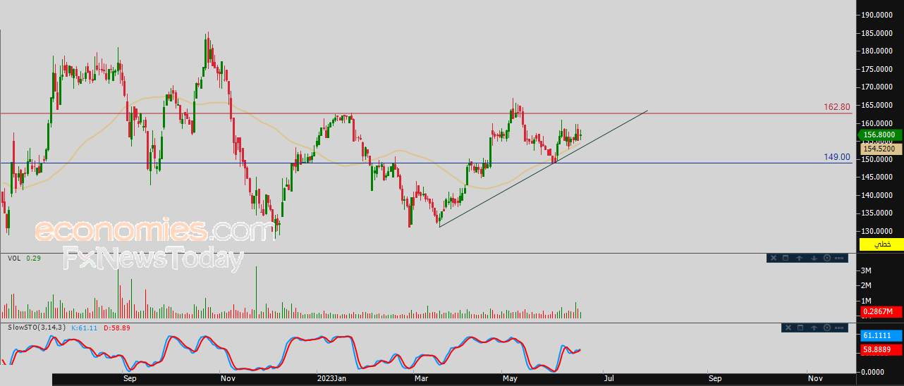 لذلك فتوقعاتنا تشير إلى المزيد من الصعود للسهم خلال تداولاته القادمة، طيلة ثبات الدعم 149.00، ليستهدف مستوى المقاومة المهم والقريب 162.80 استعداداً لمهاجمته.