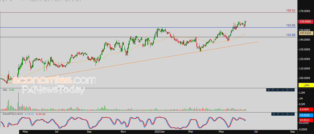 لهذا نحن نرجح ارتفاع السهم من جديد خلال تداولاته القادمة، خاصة طوال استقراره فوق مستوى 153.00، ليستهدف مستوى المقاومة 168.55.