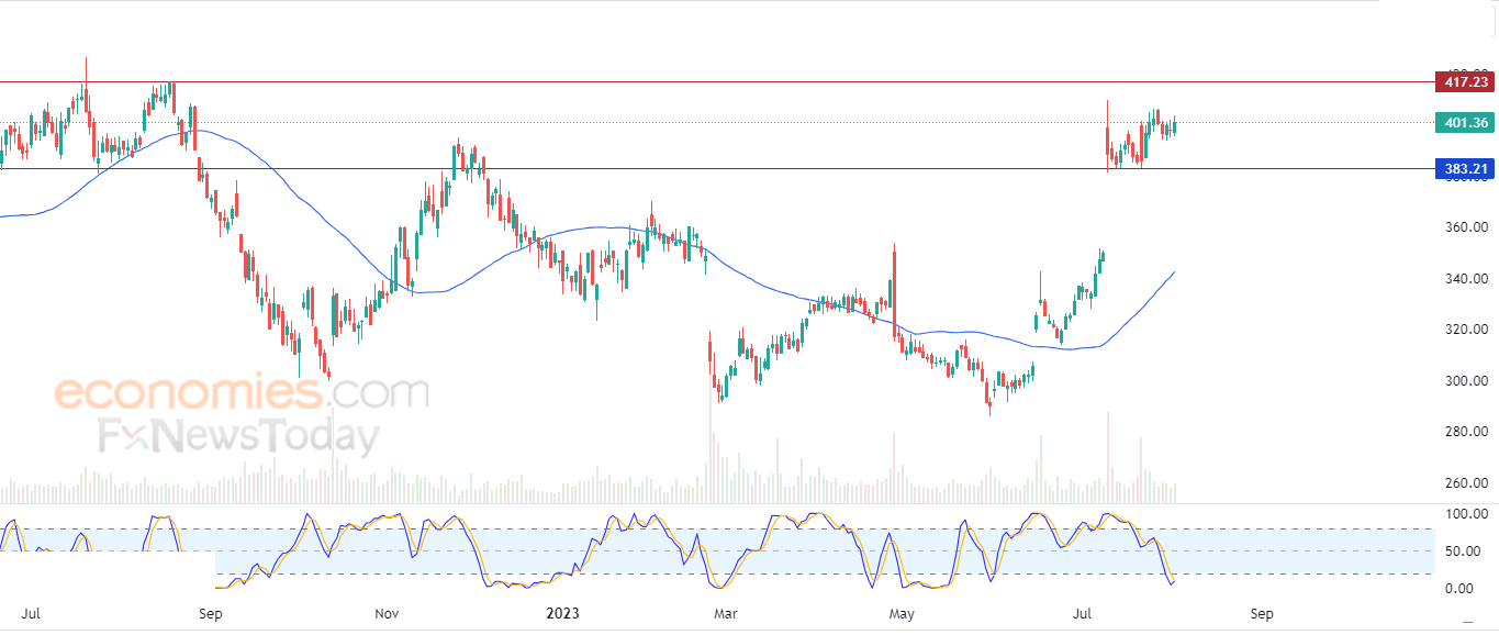 لذلك نحن نتوقع المزيد من الصعود للسهم خلال تداولاته القادمة، طيلة ثبات الدعم 383.21، ليستهدف مستوى المقاومة المحوري 417.23.