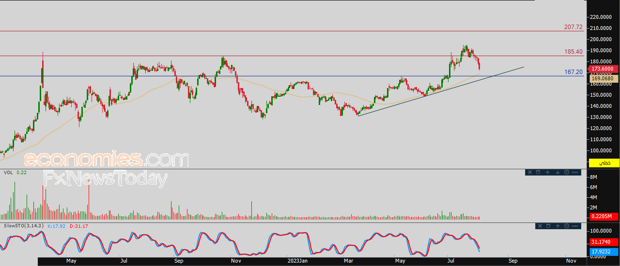لذلك تشير توقعاتنا إلى ترجيح سيناريو عودة ارتفاع السهم خلال تداولاته القادمة، طيلة ثبات الدعم 167.20، ليستهدف مستوى المقاومة المحوري 185.40 استعداداً لمهاجمته.