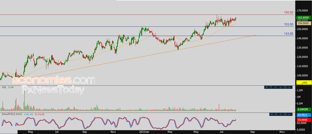 لهذا نحن نتوقع المزيد من الصعود للسهم خلال تداولاته القادمة، طيلة ثبات الدعم 153.00، ليستهدف مستوى المقاومة المهم والقريب 165.80 استعداداً لمهاجمته.