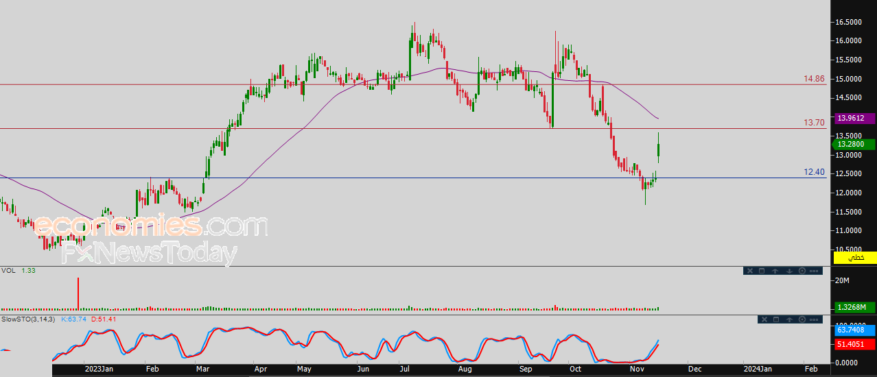 لذلك ووسط هذا الزخم الإيجابي القوي نتوقع المزيد من الصعود للسهم خلال تداولاته القادمة، بشرط اختراقه أولاً لمستوى المقاومة 13.70، ليستهدف بعدها مباشرة أولى مستويات المقاومة عند 14.86.